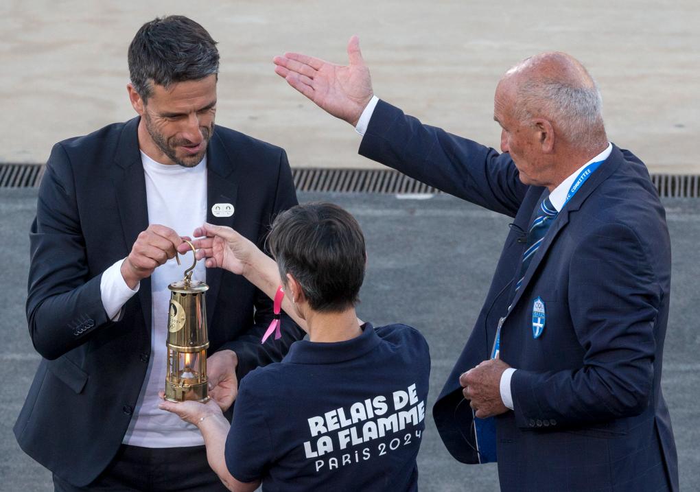 4月26日,巴黎奧組委主席埃斯坦蓋(左)將巴黎奧運會火種燈交給工作人員。新華社發(fā)(馬里奧斯·羅洛斯攝)