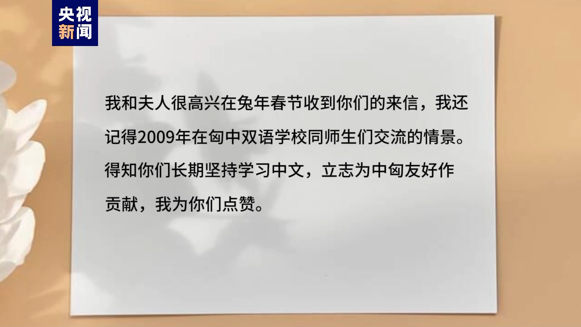 中國國家主席習(xí)近平在回信中寫道,他和夫人為在兔年春節(jié)前收到同學(xué)們的來信而感到高興,他還記得2009年在匈中雙語學(xué)校同師生們交流的情景。得知孩子們長期堅持學(xué)習(xí)中文,立志為中匈友好作貢獻(xiàn),他為孩子們點(diǎn)贊。