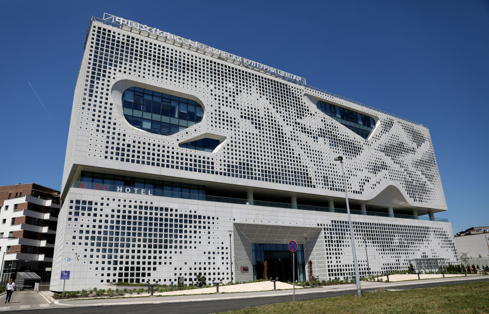 2024年4月28日在塞爾維亞首都貝爾格萊德拍攝的中國文化中心。建筑外立面通過精巧的設(shè)計,融入了中國山水畫理念。