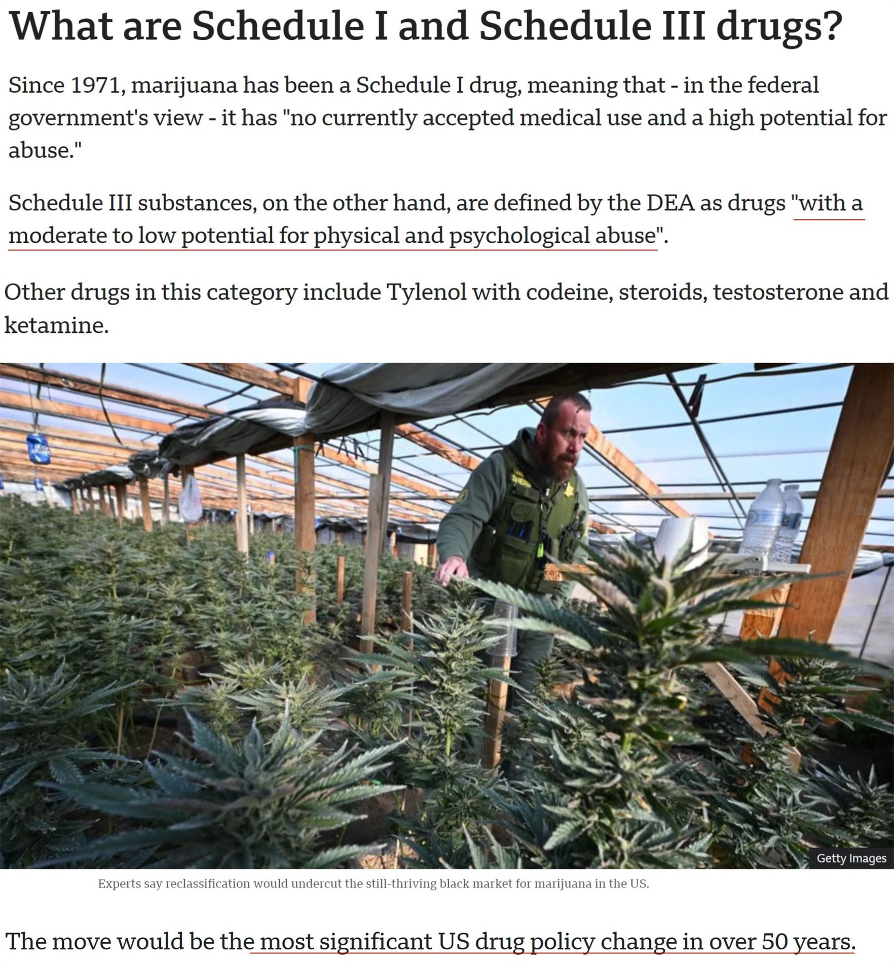 如果經(jīng)過60天的公眾意見征詢期后最終獲批,新規(guī)則雖然不會在聯(lián)邦層面將大麻完全合法化,但會將其移出《美國聯(lián)邦管制物質(zhì)法案》中列管海洛因等最危險毒品的“附表一”,轉(zhuǎn)而歸入列管氯胺酮和類固醇等危險性較低藥物的“附表三”。