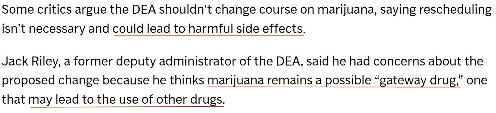 美國禁毒署前副署長杰克·萊利對擬議中的規(guī)則更改感到擔憂。他認為,大麻仍是一種“入門毒品”,可能導(dǎo)致對其他毒品的使用。