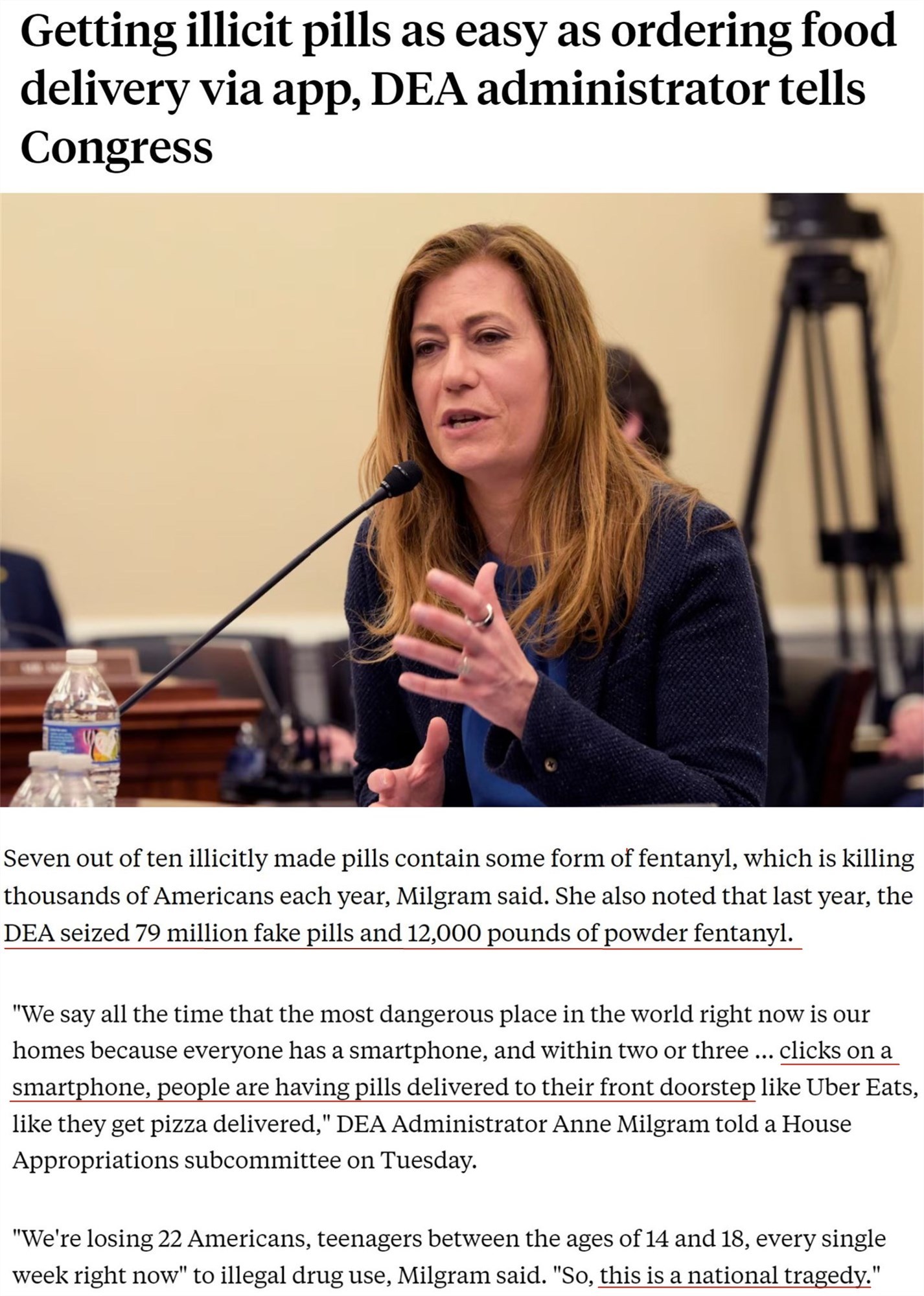 美國禁毒署署長安妮·米爾格拉姆本月早些時候告訴國會:“現(xiàn)在世界上最危險的地方就是我們的家,因為每個人都有智能手機,只要用手指點上兩三下,就能像在外賣平臺點比薩一樣,在家門口收到非法藥丸。”