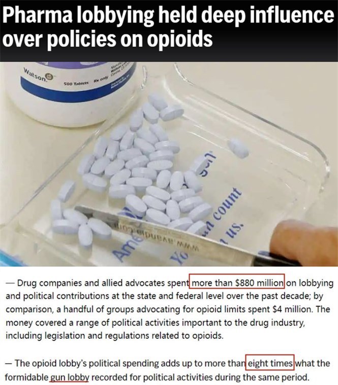 據(jù)美媒披露,為了阻止藥劑師更謹慎地開具處方、推動藥房快速售藥,阿片類藥物制造商和經(jīng)銷商在近十年內(nèi)共花費了8.8億美元用于“打通關(guān)系”,比美國槍支游說集團花的錢還要高8倍。