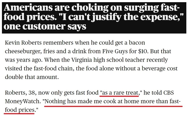 羅伯茨接受采訪時表示,他現(xiàn)在把吃快餐“當作一種難得的享受”,“快餐價格上漲,成了我在家做飯的最大理由”。