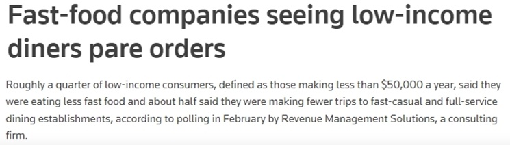 咨詢公司“收入管理解決方案”此前發(fā)布的一項民調結果顯示,年收入在5萬美元以下的美國人中,約有四分之一的人減少了快餐消費。