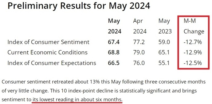 密歇根大學的最新調查顯示,由于預期通脹率和利率都將維持在高位,美國5月消費者信心指數(shù)(CSI)在連續(xù)三個月幾乎持平后較上月大幅回落了約13%,降至約半年來的最低水平。