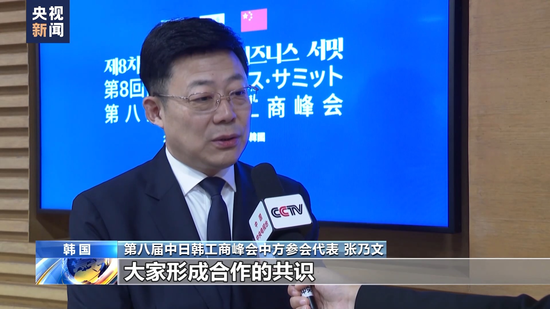 第八屆中日韓工商峰會中方參會代表 張乃文:希望通過這次峰會,我們未來在清潔能源、人工智能、健康醫(yī)療等產業(yè),大家形成合作的共識,充分利用各自的資金、技術、資源等優(yōu)勢,加快形成一次新的合作項目。