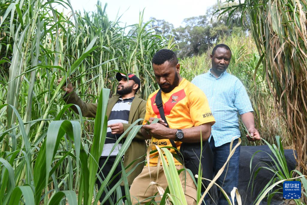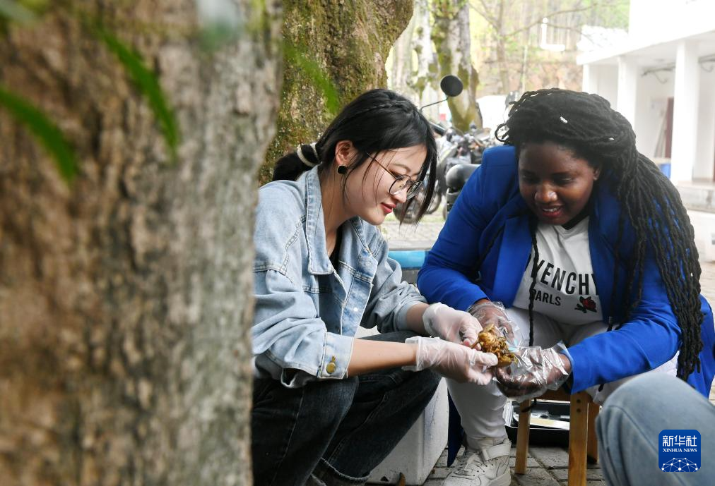 2024年3月28日,在位于福州的福建農(nóng)林大學(xué),來自盧旺達和巴布亞新幾內(nèi)亞的學(xué)生在“國際菌草苑”內(nèi)查看菌草長勢。新華社記者 林善傳 攝