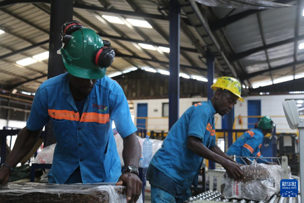 2024年6月10日,在科特迪瓦南部城鎮(zhèn)達布郊區(qū),工人們在美蘭橡膠加工廠對成品橡膠進行打包。新華社記者 張健 攝
