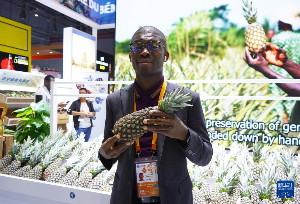 2023年11月8日,在第六屆進博會食品及農(nóng)產(chǎn)品展區(qū)貝寧菠蘿展臺,工作人員愛力舍展示貝寧菠蘿。這是貝寧菠蘿第一次參加進博會。新華社記者 金皓原 攝