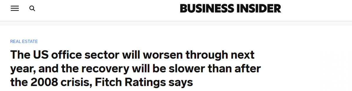惠譽(yù)稱:“與2008年全球金融危機(jī)之后相比,此輪周期中寫字樓行業(yè)的復(fù)蘇將更加緩慢、耗時(shí),并將導(dǎo)致美國(guó)房地產(chǎn)價(jià)值永久性受損、業(yè)績(jī)表現(xiàn)疲軟以及貸款損失增加?!?/p>