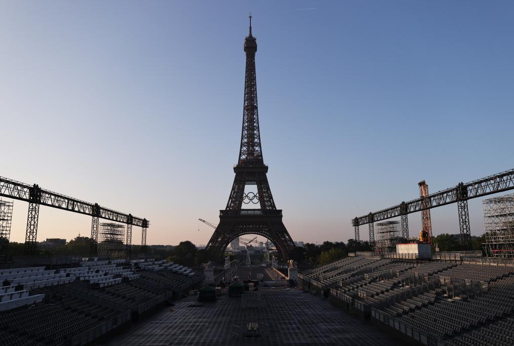 這是6月7日清晨在法國巴黎拍攝的懸掛奧運(yùn)五環(huán)標(biāo)志的埃菲爾鐵塔以及正在搭建看臺(tái)的特羅卡德羅廣場,巴黎奧運(yùn)會(huì)開幕式的慶?;顒?dòng)將在這里舉行。 新華社記者高靜攝