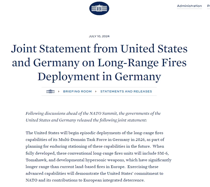 在上周的北約華盛頓峰會期間,美國和德國聯合宣布,作為長期規(guī)劃的一部分,美國將從2026年開始分階段在德國部署遠程武器。