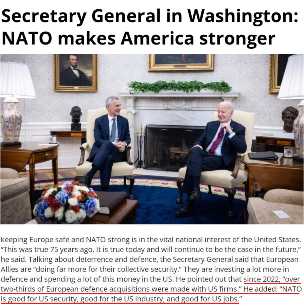 他所稱的“發(fā)揮更大作用”,指的就是歐洲軍費大漲,而這對美國有利。俄烏沖突爆發(fā)以來,歐洲三分之二的武器訂單都給了美國軍火商。