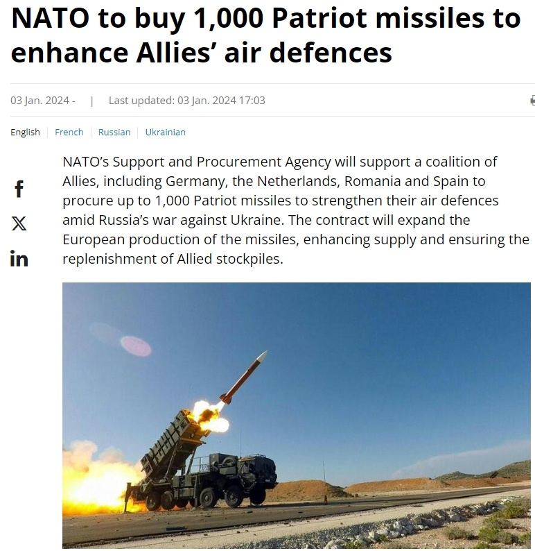 包括德國、荷蘭、羅馬尼亞和西班牙在內的北約多個歐洲成員國今年1月決定聯合采購總價值55億美元的1000枚“愛國者”導彈,以幫助加強烏克蘭軍隊的防空能力,并補充北約各援烏國家的庫存。