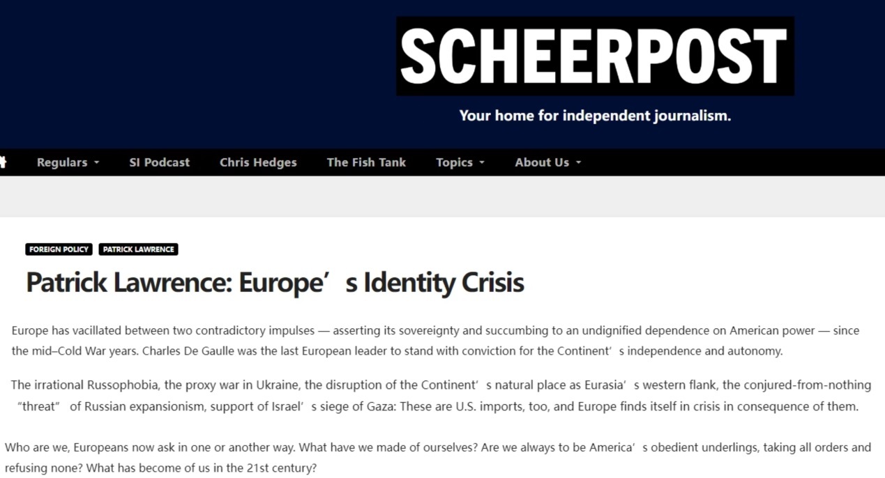 美國資深媒體人兼作家帕特里克·勞倫斯此前發(fā)文指出,自冷戰(zhàn)中期以來,歐洲始終在“維護自身主權”和“對美國實力的無尊嚴依賴”這對矛盾之間搖擺不定。而美國重新把矛頭對準俄羅斯后,更是在歐洲引發(fā)了嚴重的身份危機。