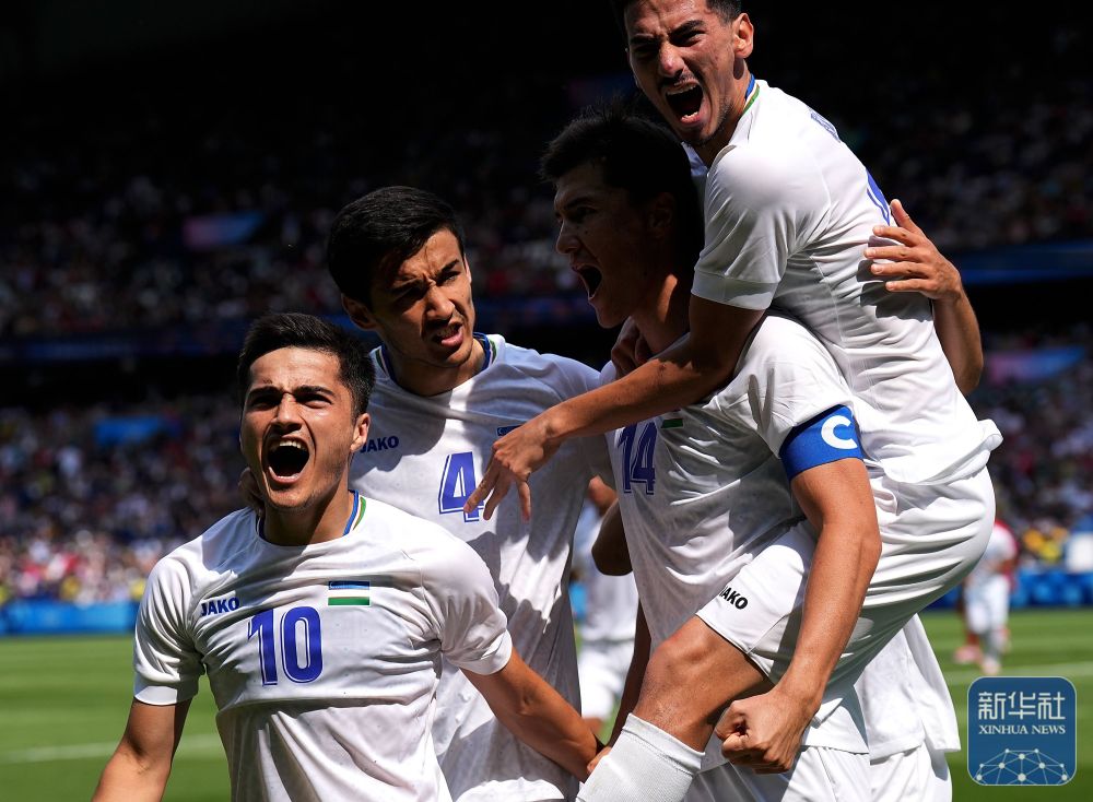 烏茲別克斯坦隊(duì)球員在比賽中慶祝進(jìn)球。新華社記者 黃宗治 攝