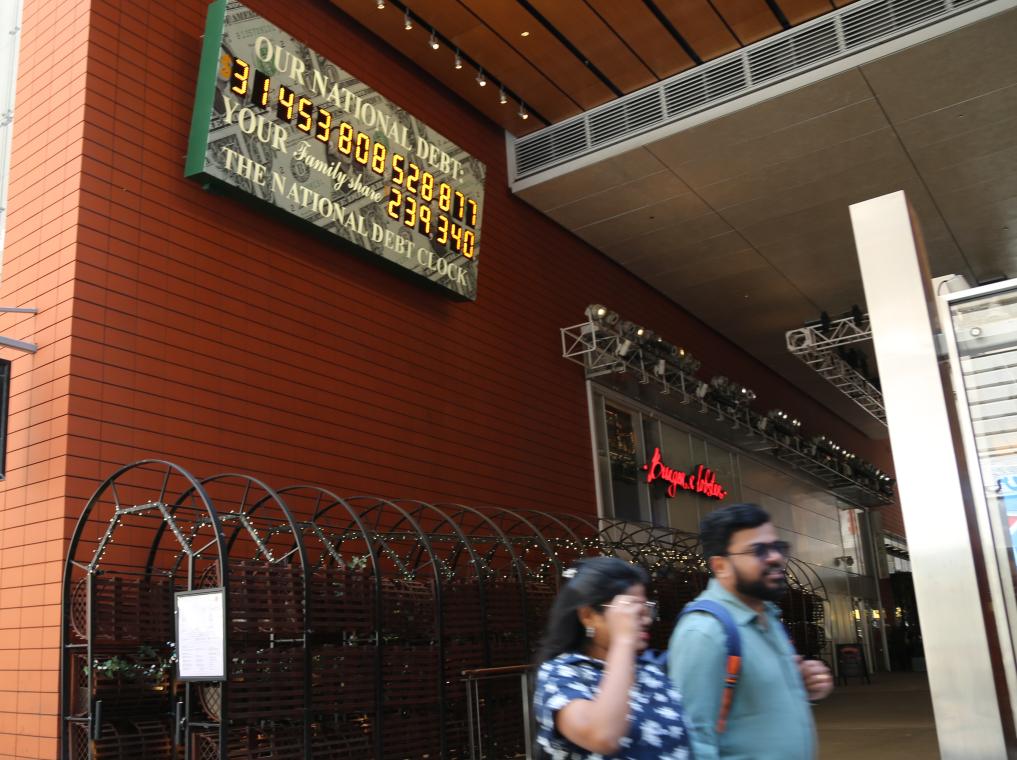 2023年5月29日,人們經(jīng)過美國紐約曼哈頓的“國債鐘”?!皣鴤姟笔且粋€(gè)大型計(jì)數(shù)器,它實(shí)時(shí)更新美國的公共債務(wù)總額,并顯示出每個(gè)美國家庭所要負(fù)擔(dān)的數(shù)額。 新華社記者劉亞南攝
