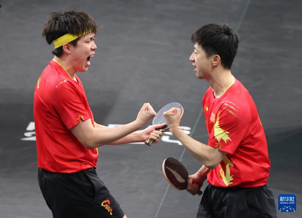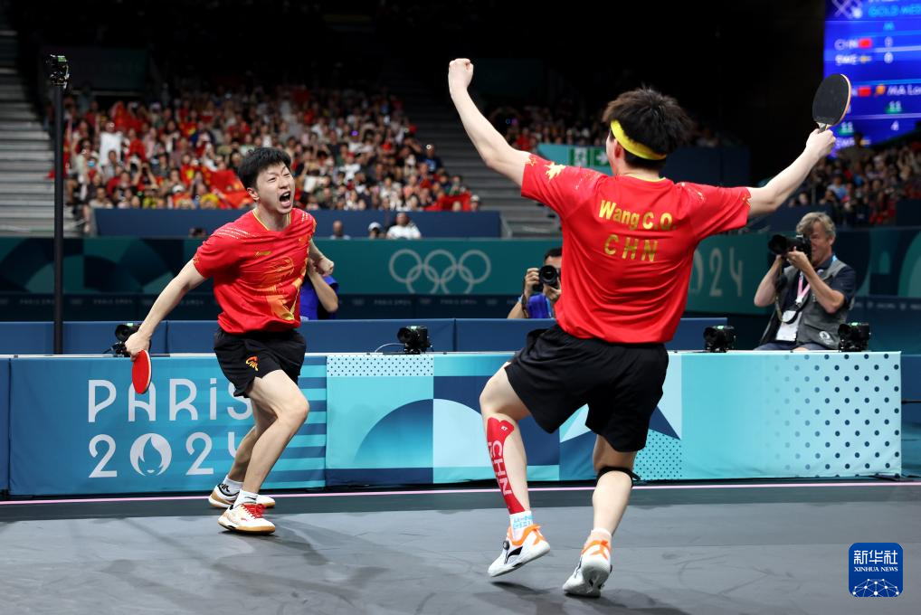 8月9日,中國隊(duì)組合馬龍(右)/王楚欽慶祝勝利。新華社記者 盧燁 攝