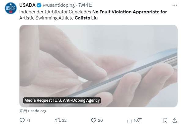 這屆奧運(yùn)會(huì),享受了美國(guó)這項(xiàng)“服務(wù)”的除了花游運(yùn)動(dòng)員卡莉斯塔,還有田徑運(yùn)動(dòng)員埃里揚(yáng)·奈頓。他們分別在5月和3月藥檢陽(yáng)性,但巧的是,美國(guó)官方對(duì)這兩人的脫罪聲明都是卡在奧運(yùn)會(huì)前發(fā)出,“及時(shí)”地保住了他們的參賽資格,然后美國(guó)反興奮劑機(jī)構(gòu)官網(wǎng)又“及時(shí)”地把聲明刪掉了。