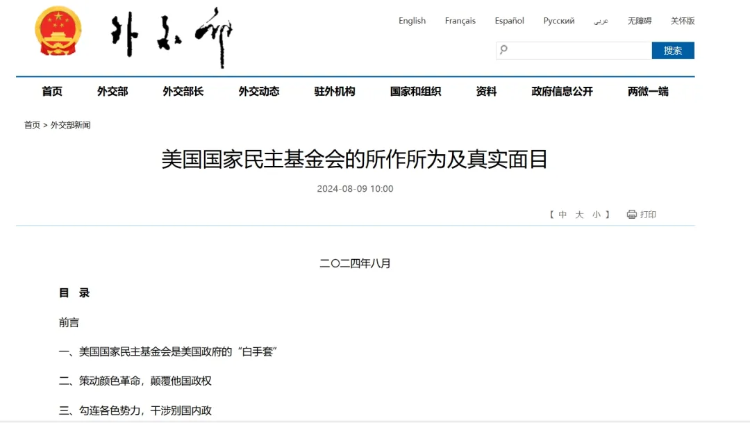 8月9日,中國外交部網(wǎng)站發(fā)布一份重磅報(bào)告:《美國國家民主基金會的所作所為及真實(shí)面目》。