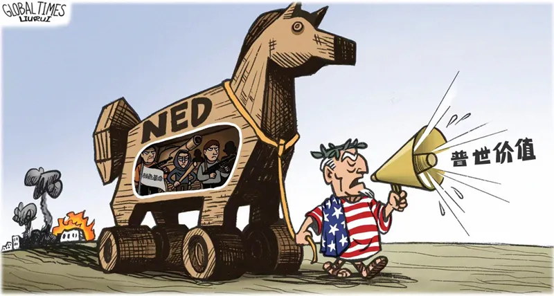 長期以來,美國將所謂普世價(jià)值工具化、武器化,煽動分裂對抗,干涉別國內(nèi)政,造成災(zāi)難性后果。NED就是美國政府禍亂別國的“特洛伊木馬”。圖源:《環(huán)球時(shí)報(bào)》