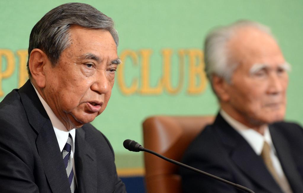 2015年6月9日,在日本東京,日本前內(nèi)閣官房長官河野洋平(左)發(fā)表講話。當(dāng)日,河野洋平和前首相村山富市在日本記者俱樂部舉行對談,重申承認(rèn)殖民侵略歷史事實、堅持和平憲法對日本的重要意義。新華社記者馬平攝