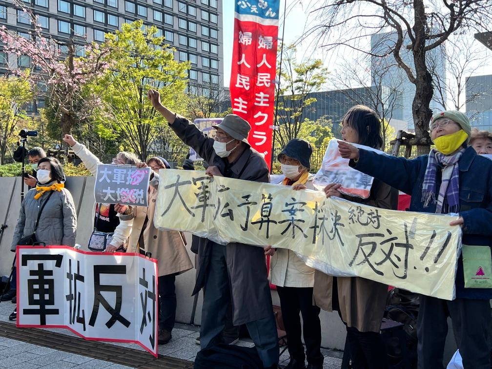 2023年3月28日,在日本東京,民眾在參議院議員會館前舉行抗議活動,反對參議院當(dāng)天通過“軍備擴(kuò)張預(yù)算”案。新華社記者姜俏梅攝