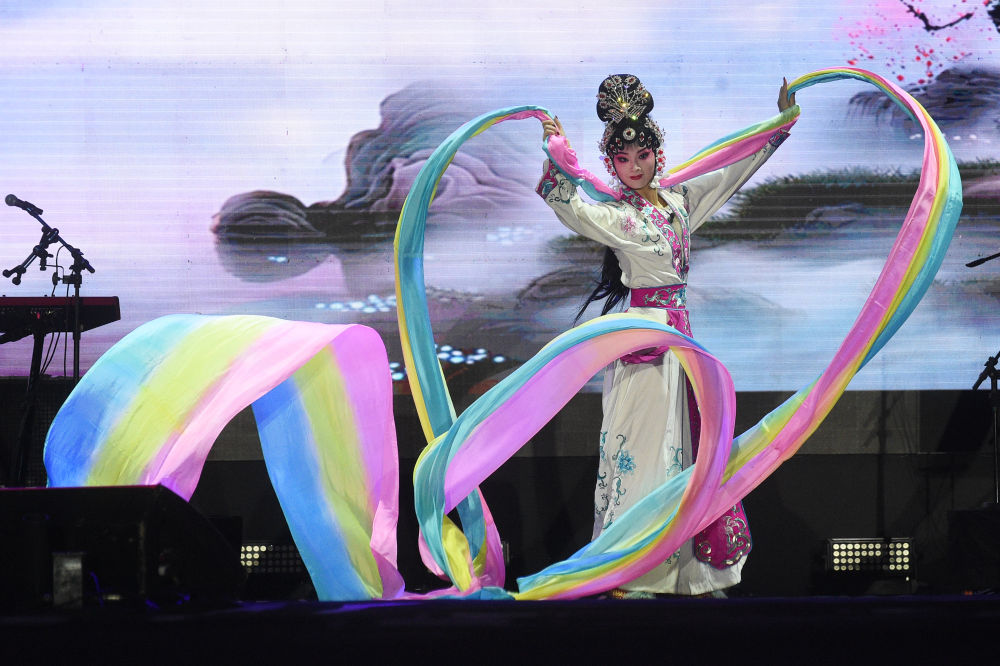 ↑8月17日,在巴西首都巴西利亞,來(lái)自浙江婺劇藝術(shù)研究院的演員在沙灘藝術(shù)節(jié)中國(guó)日活動(dòng)上表演。