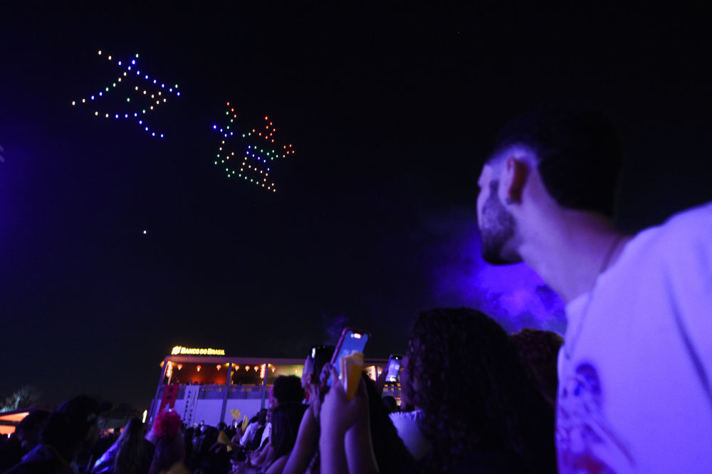 ↑8月17日,在巴西首都巴西利亞,人們?cè)谏碁┧囆g(shù)節(jié)中國(guó)日活動(dòng)上觀看無(wú)人機(jī)表演。