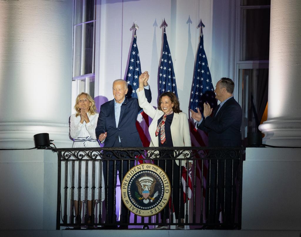 這是7月4日在美國(guó)首都華盛頓白宮拍攝的美國(guó)總統(tǒng)拜登(左二)和副總統(tǒng)哈里斯(右二)。新華社記者胡友松攝