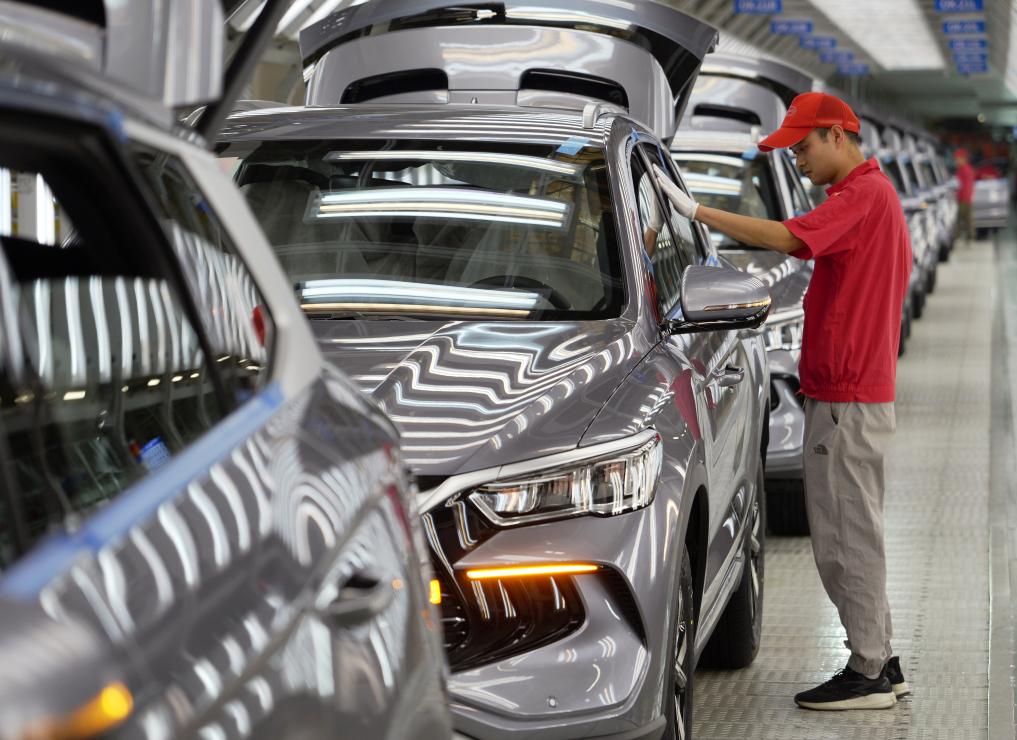 2024年4月24日,工人在位于河南省鄭州市的鄭州航空港區(qū)比亞迪總裝工廠新能源汽車“宋Pro”生產(chǎn)線上對車輛進行質(zhì)檢。新華社記者李嘉南攝