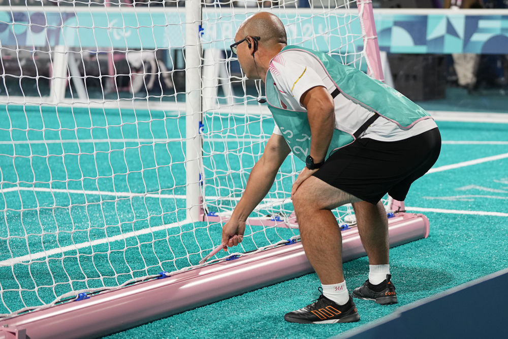 9月1日,中國隊引導員李進在比賽中用金屬棒敲擊門框幫助球員定位。新華社記者 熊琦 攝