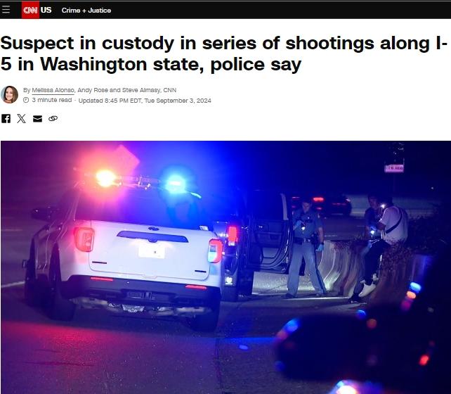 據(jù)美國(guó)有線電視新聞網(wǎng)(CNN)3日?qǐng)?bào)道,美國(guó)官員們稱,華盛頓州西雅圖和塔科馬市5號(hào)州際公路部分路段發(fā)生一系列槍擊事件,造成6人受傷,嫌疑人已被拘捕。
