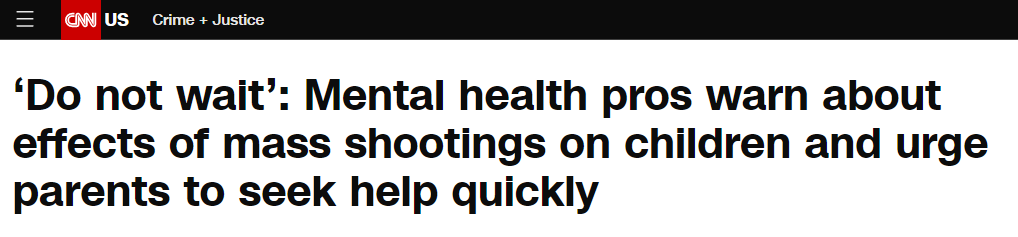薩爾茲和羅辛-斯萊特都警告表示,(美國社會)急需對校園槍擊事件或一般槍支暴力事件中幸存的兒童及青少年出現(xiàn)的心理健康問題作出反應(yīng),這對保護他們的未來至關(guān)重要。