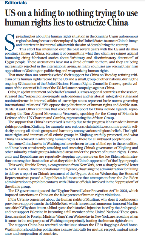 9月24日,日內(nèi)瓦舉行的聯(lián)合國人權(quán)理事會第五十七屆會議上,美國等少數(shù)國家發(fā)言攻擊抹黑中國人權(quán)狀況。對此,100多個國家以共同發(fā)言、單獨發(fā)言等不同方式仗義執(zhí)言,支持中方正義立場。
