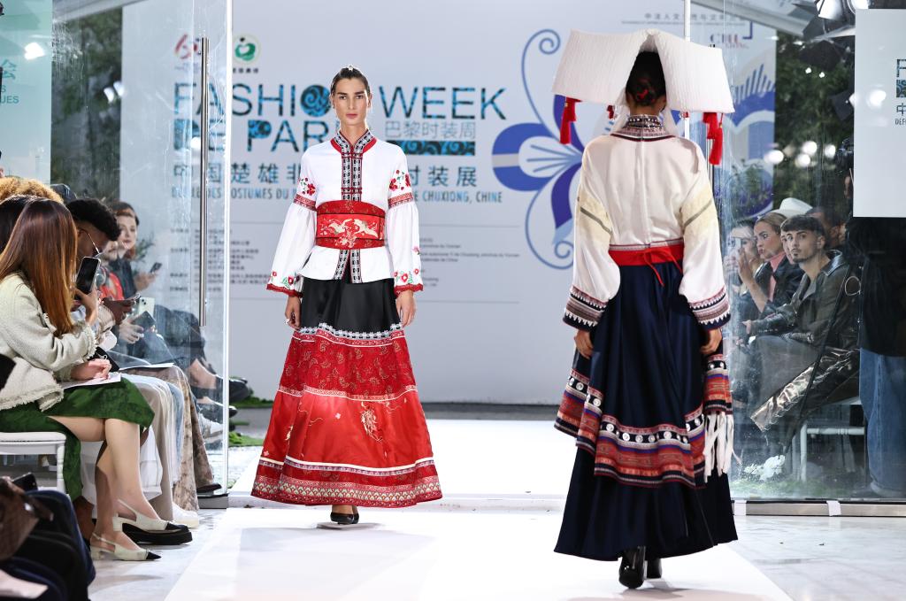 9月26日,模特在法國(guó)巴黎舉行的中國(guó)楚雄彝族服飾非遺時(shí)裝展上展示時(shí)裝。新華社記者 高靜 攝