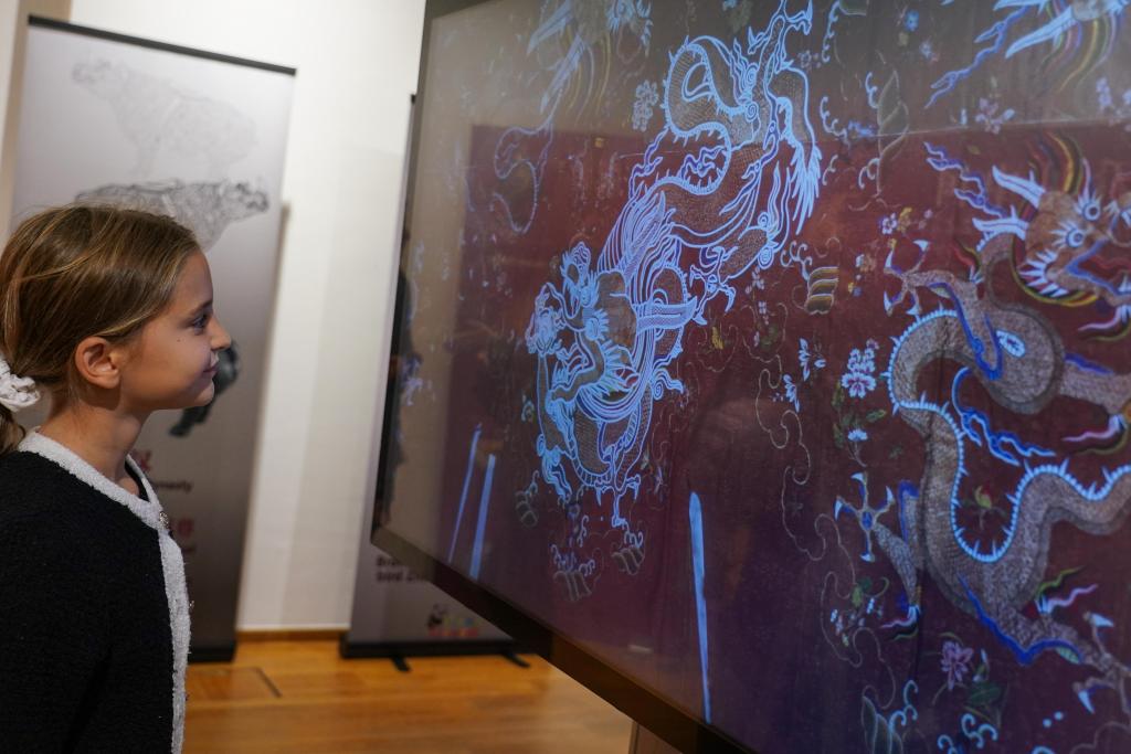 9月27日,在比利時(shí)布魯塞爾中國(guó)文化中心,觀眾在“看見(jiàn)中國(guó)”之《紋樣與色彩:中華工藝之美》數(shù)字文化展上參觀。新華社記者 彭子洋 攝