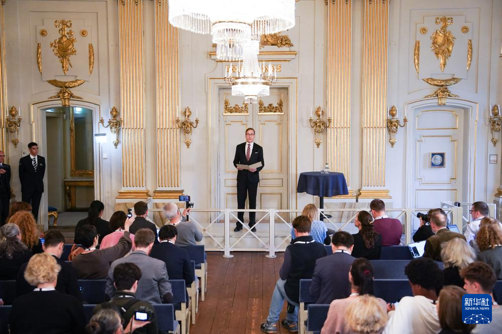 10月10日,瑞典文學院常任秘書馬茨·馬爾姆在斯德哥爾摩舉行的新聞發(fā)布會上揭曉獲獎者。新華社記者 彭子洋 攝