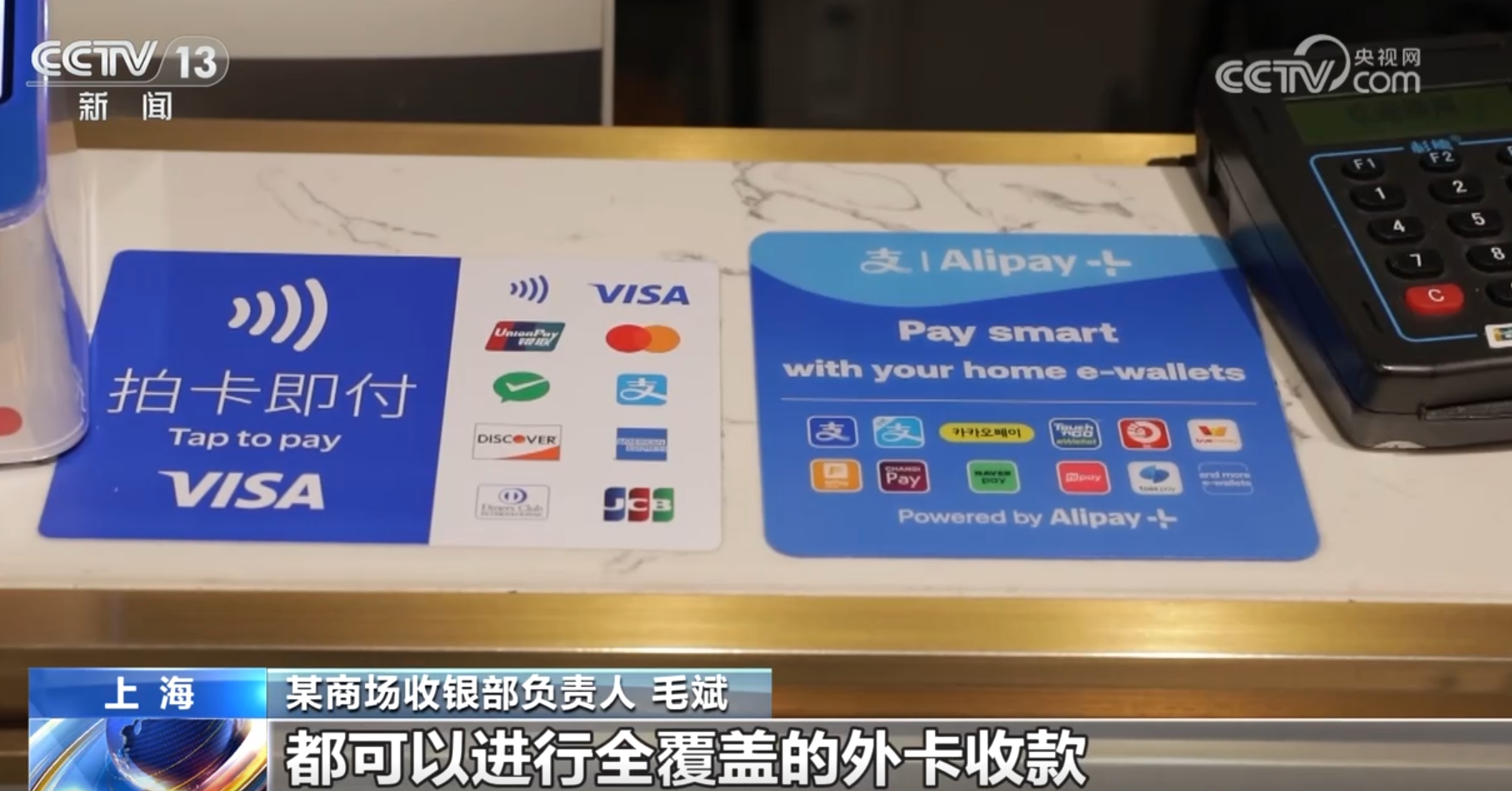 某商場(chǎng)收銀部負(fù)責(zé)人毛斌稱:“外國(guó)顧客到我們商場(chǎng)購(gòu)物越來(lái)越多了,所以我們針對(duì)外國(guó)顧客的付款方式進(jìn)行了收銀方面的調(diào)整改進(jìn),目前商場(chǎng)所有的收銀設(shè)備都可以進(jìn)行全覆蓋的外卡收款?!?/p>