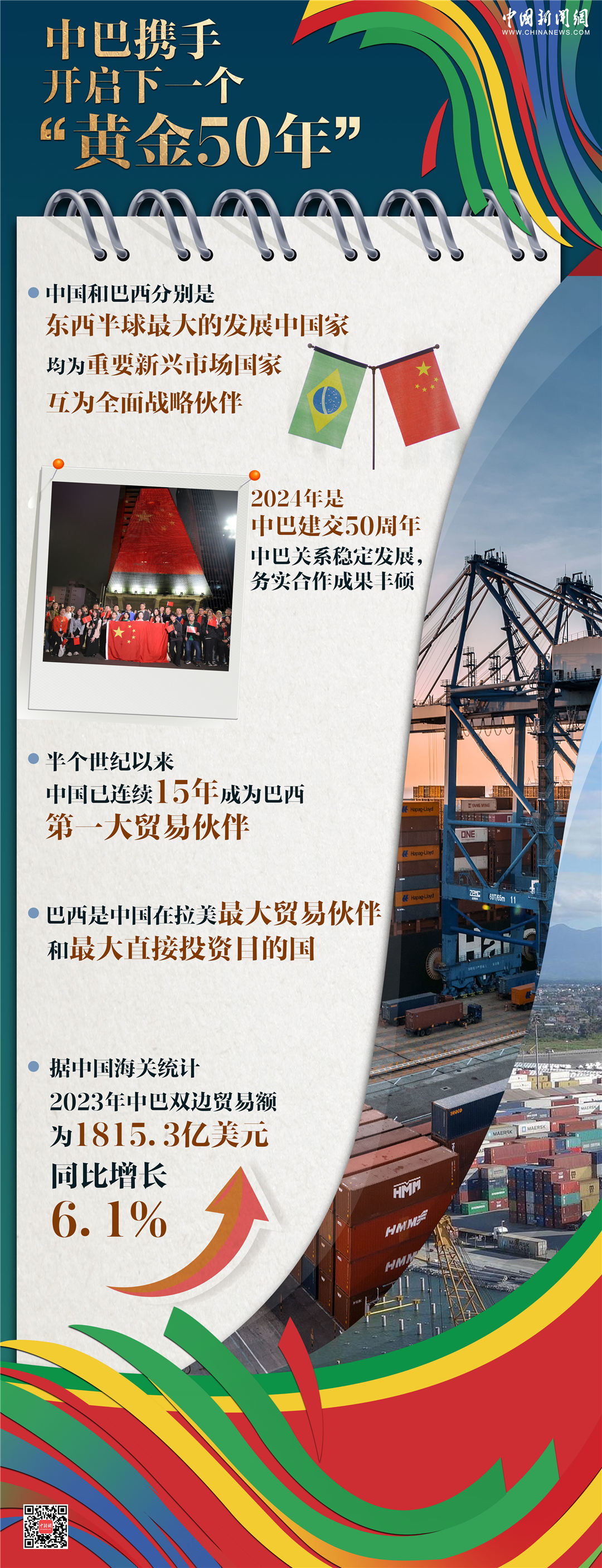 “中國(guó)和巴西同為發(fā)展中大國(guó)和重要新興市場(chǎng)國(guó)家,是志同道合的好朋友、攜手前行的好伙伴。”2024年8月15日,習(xí)近平主席同巴西總統(tǒng)盧拉互致賀電,慶祝兩國(guó)建交50周年。