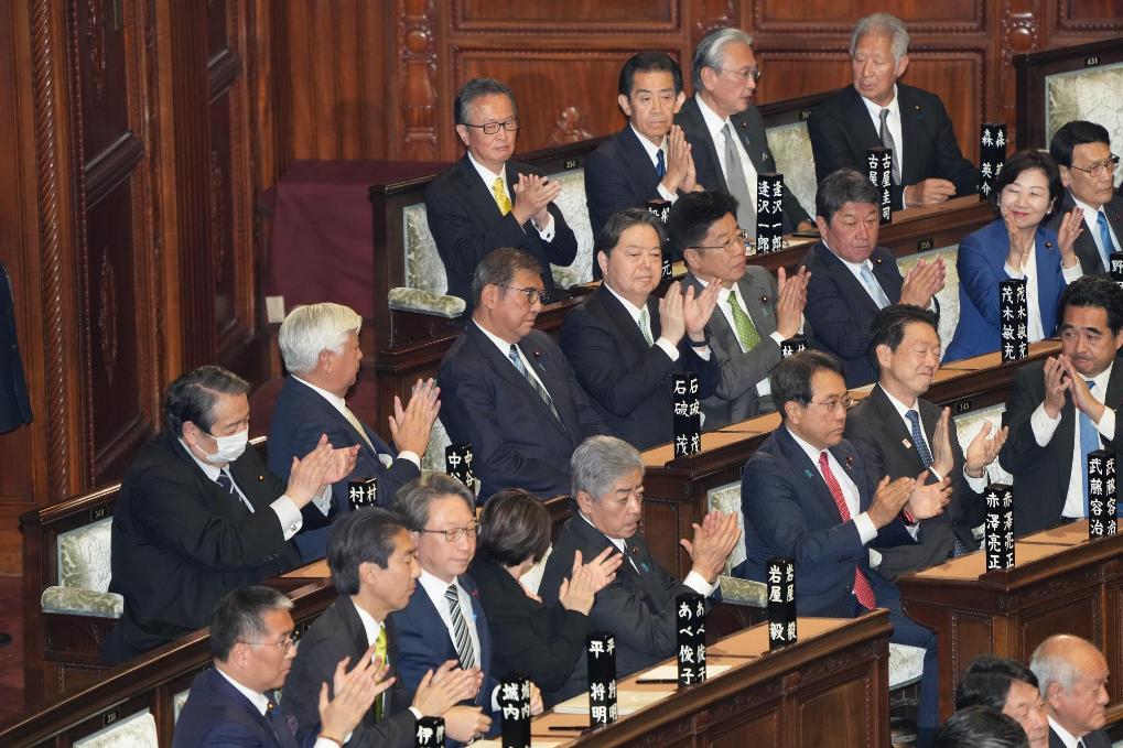 11月11日,在位于日本東京的日本國(guó)會(huì)眾議院會(huì)議現(xiàn)場(chǎng),石破茂接受祝賀。新華社記者張笑宇攝