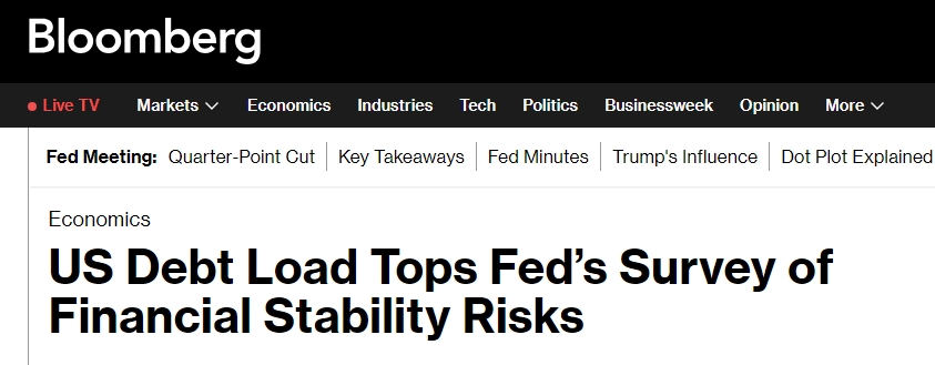 彭博社(Bloomberg)在報(bào)道中提到,美國政府的債務(wù)負(fù)擔(dān)現(xiàn)在被認(rèn)為是金融穩(wěn)定面臨的最大風(fēng)險(xiǎn),在美聯(lián)儲的一項(xiàng)調(diào)查中,其重要性超過了持續(xù)的通貨膨脹。逾半數(shù)受訪者(54%)認(rèn)為美國財(cái)政債務(wù)的可持續(xù)性是一個突出風(fēng)險(xiǎn),而半年前這一比例僅為40%。美聯(lián)儲的半年度金融穩(wěn)定報(bào)告寫道:“美國財(cái)政債務(wù)可持續(xù)性方面的擔(dān)憂位居榜首,其次是中東緊張局勢升級和政策的不確定性。”