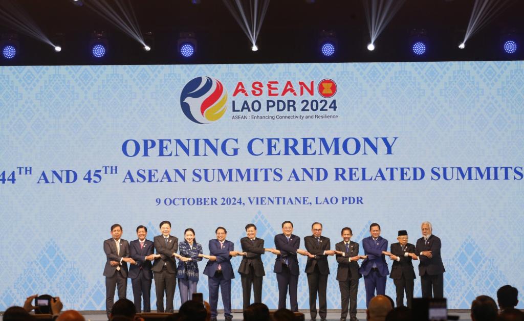 這是10月9日在老撾首都萬象拍攝的第44屆和第45屆東盟峰會開幕式現(xiàn)場。新華社發(fā)