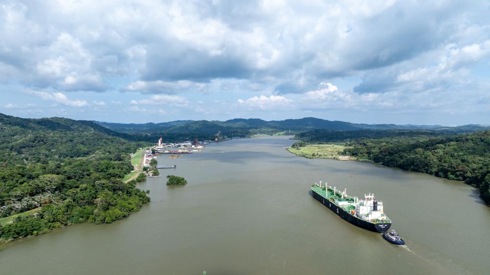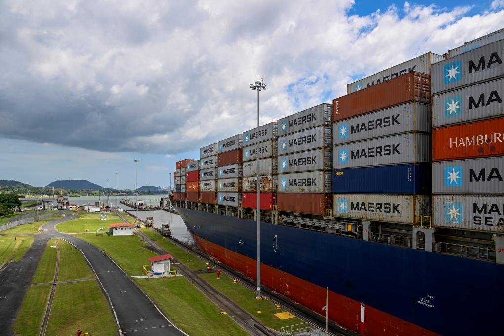 8月28日,在巴拿馬首都巴拿馬城附近,一艘貨輪通過巴拿馬運河的米拉弗洛雷斯船閘準備駛?cè)胩窖?。新華社記者李木子攝
