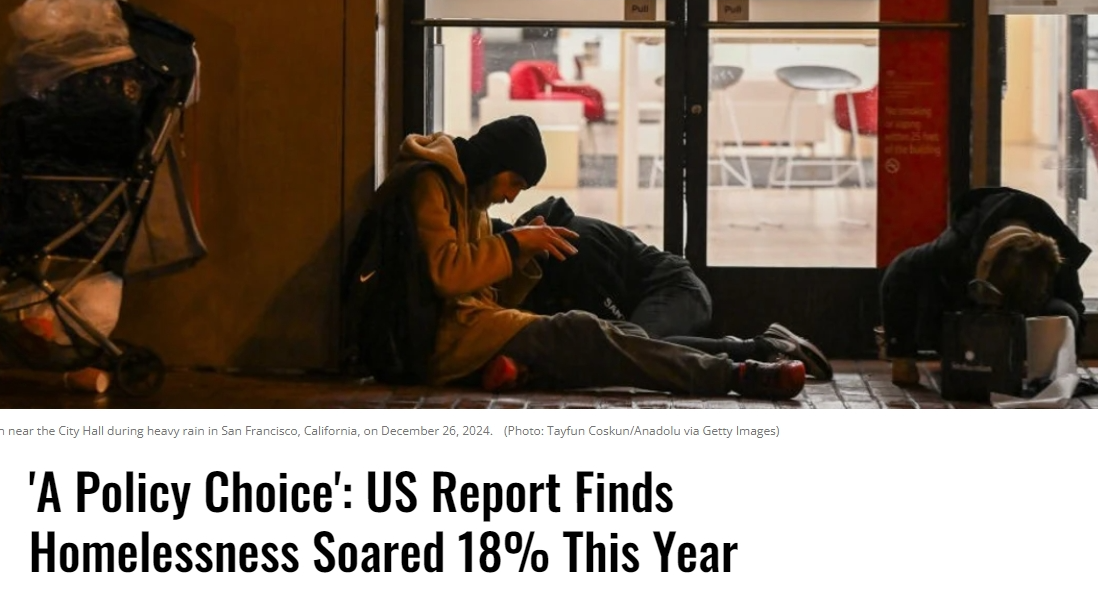 美國住房和城市發(fā)展部(HUD)本月27日發(fā)布報告稱,美國聯(lián)邦無家可歸者追蹤系統(tǒng)記錄到的無家可歸者數(shù)量已超過77萬,與去年同期相比驟增了18.1%,也是自2007年開始此項統(tǒng)計以來的最大增幅。對此,美國《共同夢想》網(wǎng)站(Common Dreams)報道指出,這完全是“政策選擇”,后果可以預(yù)見。