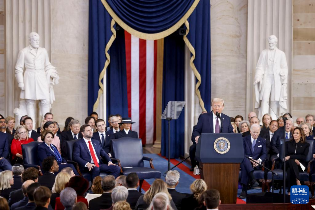 1月20日,在美國(guó)首都華盛頓國(guó)會(huì)大廈圓形大廳,特朗普在美國(guó)第47任總統(tǒng)就職典禮上發(fā)表講話(huà)。新華社/美聯(lián)