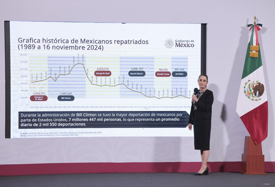 2025年1月21日,墨西哥總統(tǒng)辛鮑姆在首都墨西哥城舉行的例行新聞發(fā)布會(huì)上講話。新華社發(fā)(墨西哥總統(tǒng)府供圖)