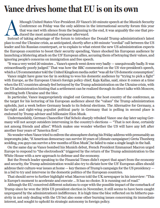 就在萬斯的慕尼黑之行“翻車”之際,法國總統(tǒng)馬克龍?jiān)诮邮堋督鹑跁r(shí)報(bào)》采訪時(shí)呼吁歐洲加快行動,以新的國防和經(jīng)濟(jì)政策應(yīng)對特朗普政府回歸白宮所帶來的“電擊式?jīng)_擊”。但馬克龍可能沒想到,特朗普政府不僅在經(jīng)濟(jì)和安全問題上向歐洲施壓,還試圖對歐洲國家如何處理國內(nèi)文化戰(zhàn)爭問題指手畫腳。萬斯的演講表明,美國政府甚至有意介入歐洲國家的內(nèi)政。正如馬克龍所言:“歐洲已經(jīng)別無選擇,歐洲已經(jīng)快無路可走了。”