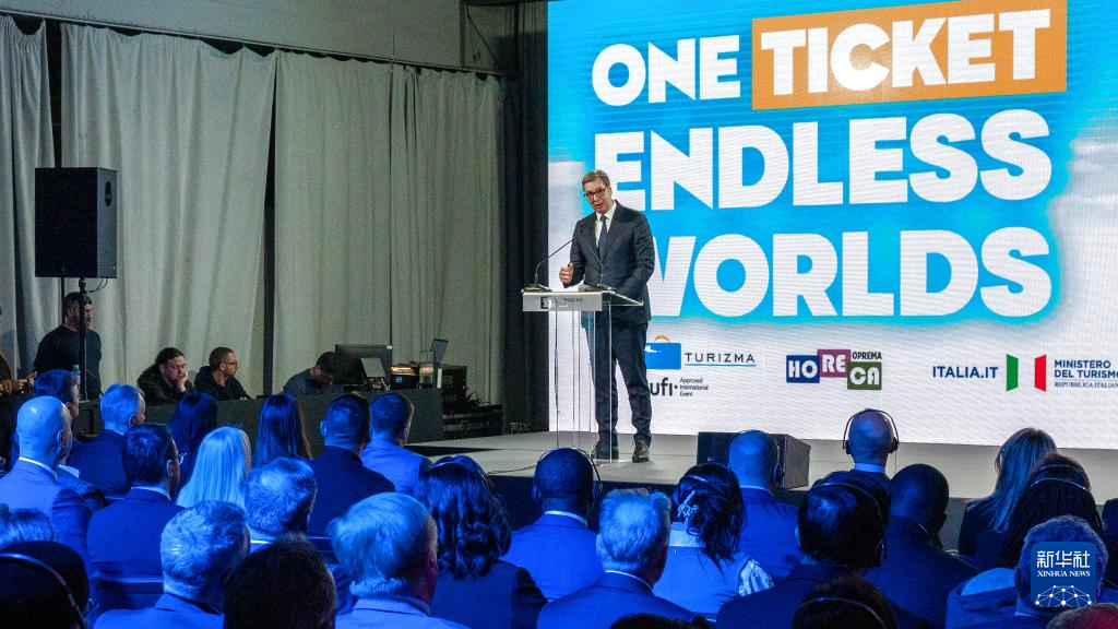 2月19日,在塞爾維亞貝爾格萊德,塞爾維亞總統(tǒng)武契奇出席第46屆貝爾格萊德國(guó)際旅游博覽會(huì)開(kāi)幕式并致辭。新華社發(fā)(內(nèi)馬尼亞攝)